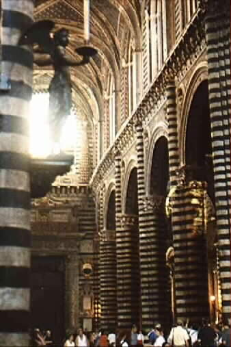 Inside the Duomo black and white marble pillars support the vault