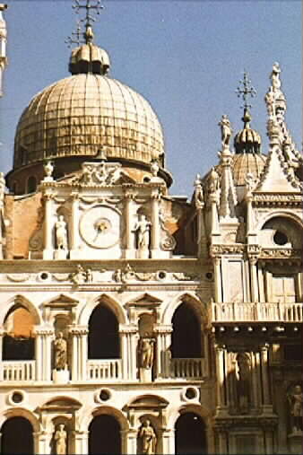 Two of the five domes of the Byzantine gothic Basilica San Marco visible from the courtyard of the Doge's Palace